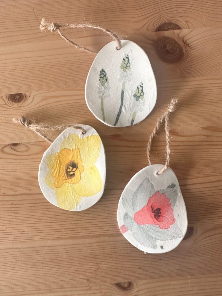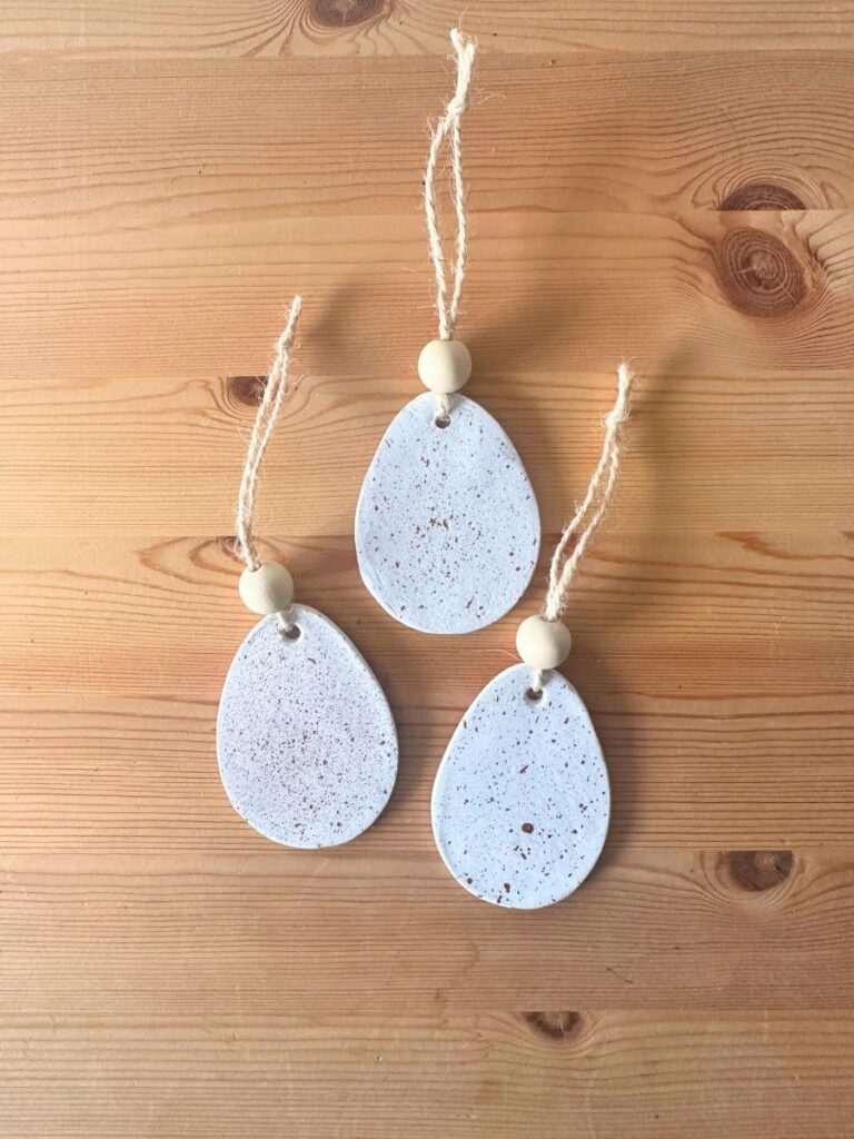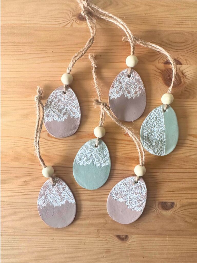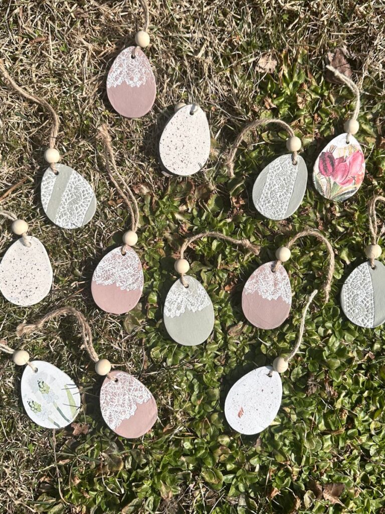 Savesta tehdyt munat kuivatin painon alla, ja niistä tulikin tasaisia ja juuri sellaisia kuin toivoin. Kevyen hionnan jälkeen pääsin koristelemaan: osa sai ylleen maalia, toisiin painoin kuvioita kosteaan saveen ja maalasin kuivumisen jälkeen ja muutamat koristelin decoupage-tekniikalla. Lopuksi lisäsin vielä puuhelmen ja juuttinarun – ja näihin versioihin olen oikeasti tosi tyytyväinen.